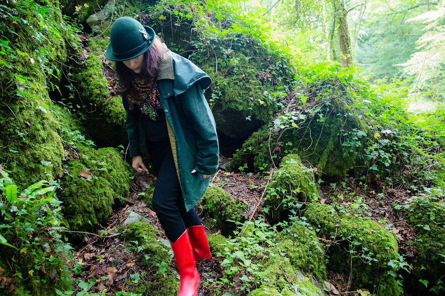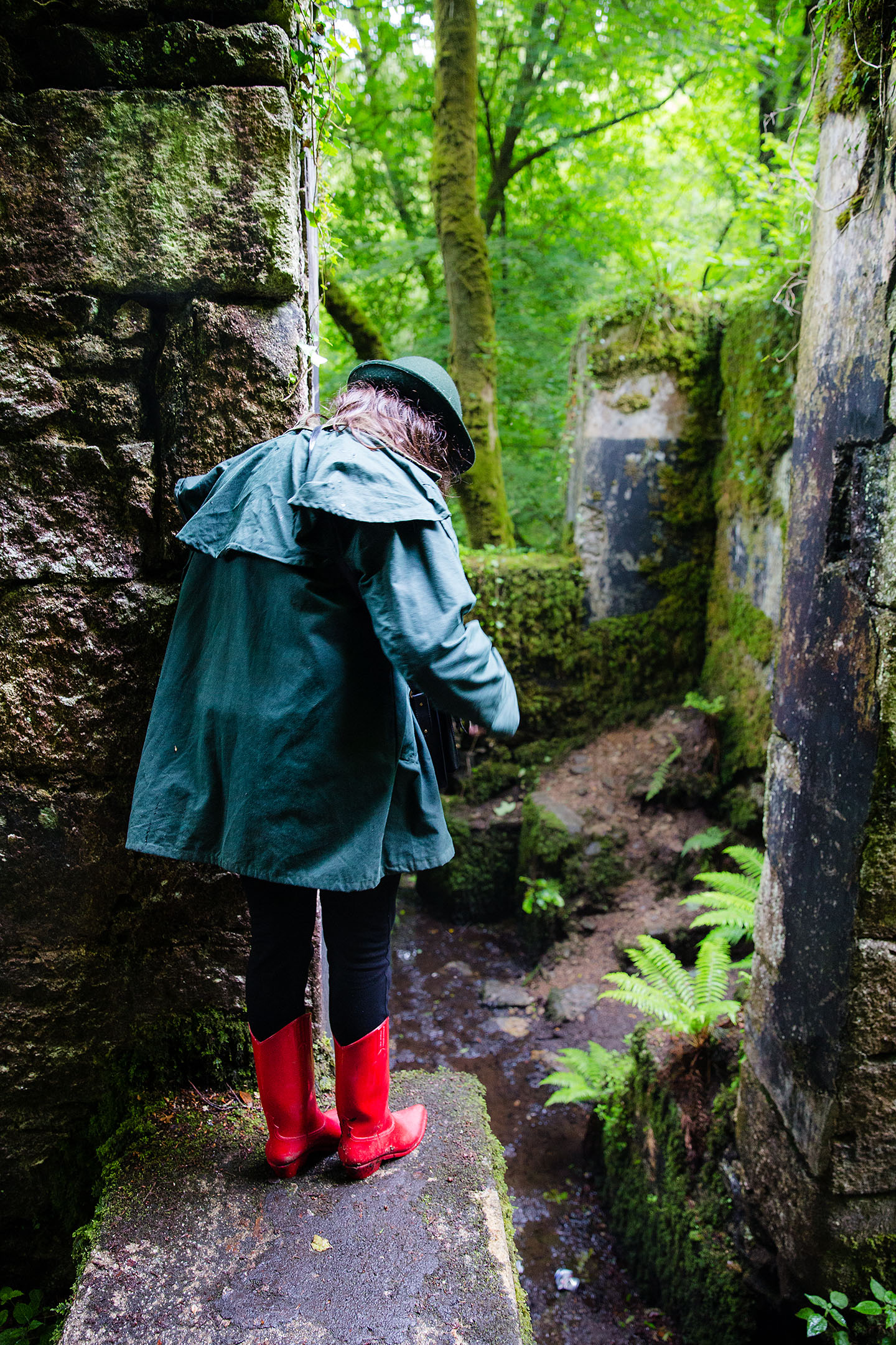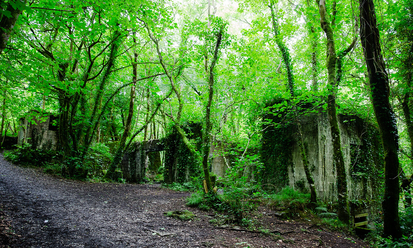 It was dark and drizzly, the air was saturated, and water ran through every crevice. Ferns and beech trees sprawl up, bathing the surroundings in dappled green hues. Remnants of the factory emerge through the greenery, still largely intact.