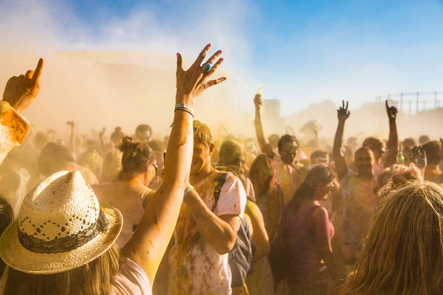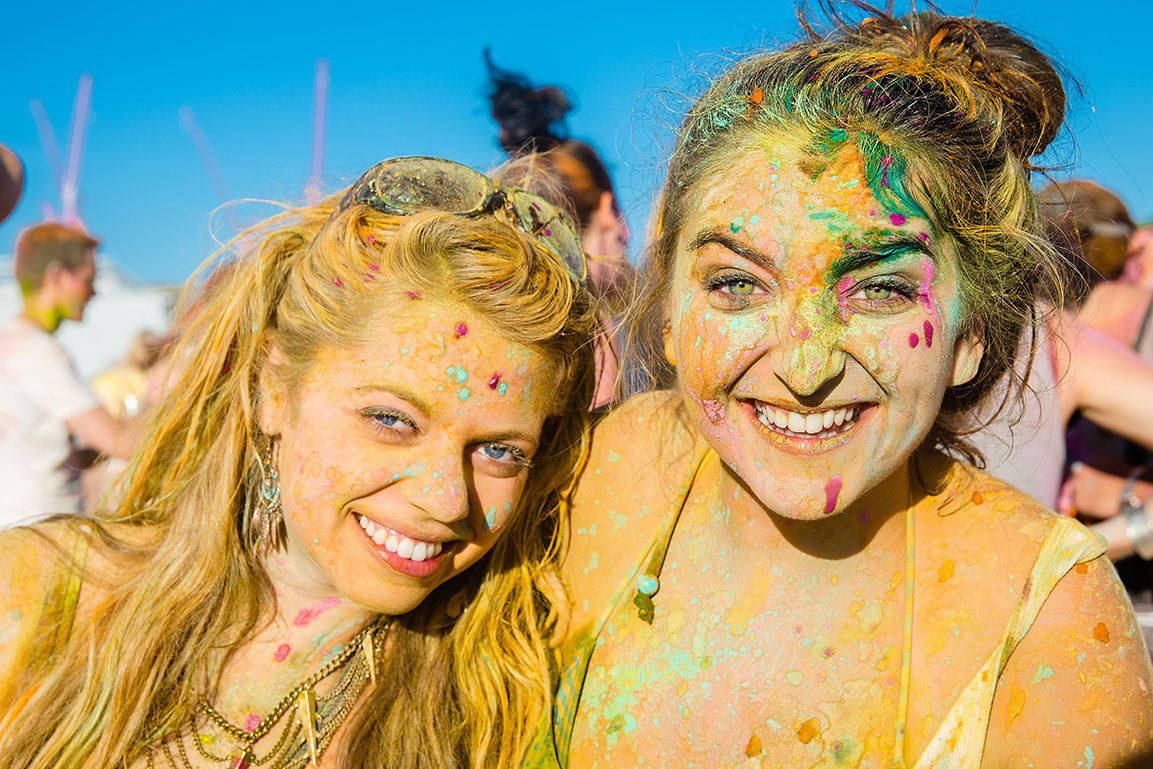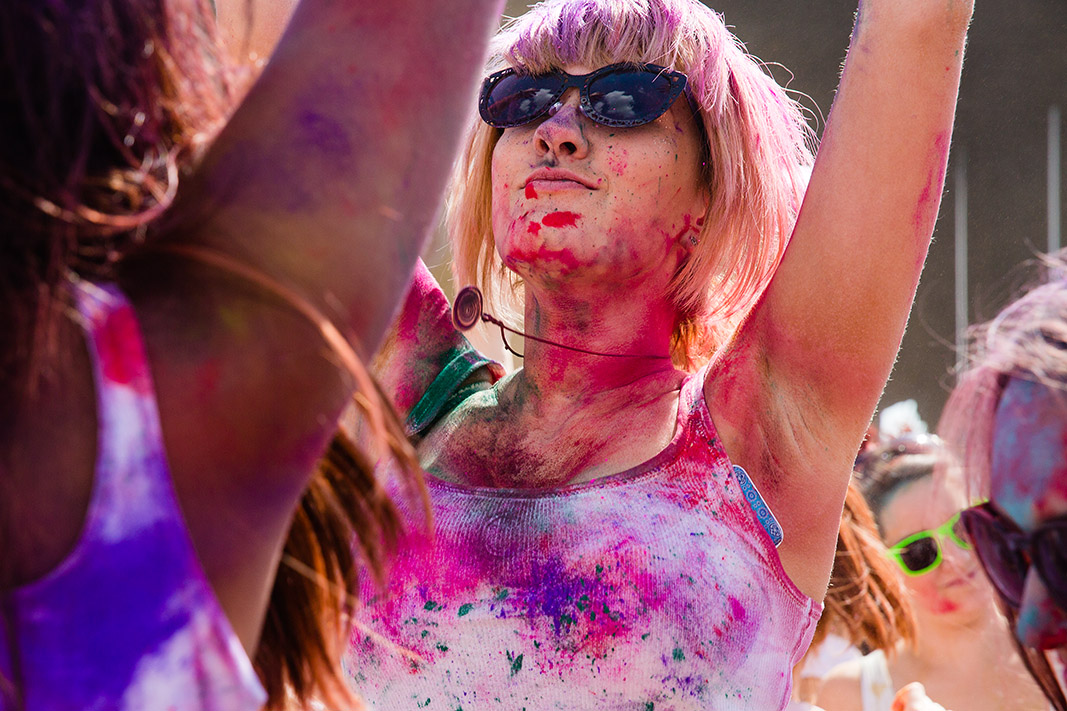 Every hour festival goers were encouraged to throw their powder en-mass. As they did, clouds of colour blocked out the sunlight, and participants were caked from head to toe in layers of powder.