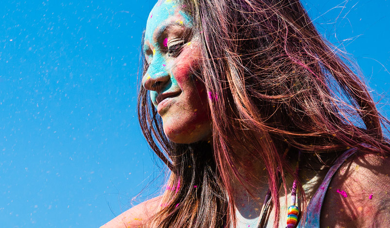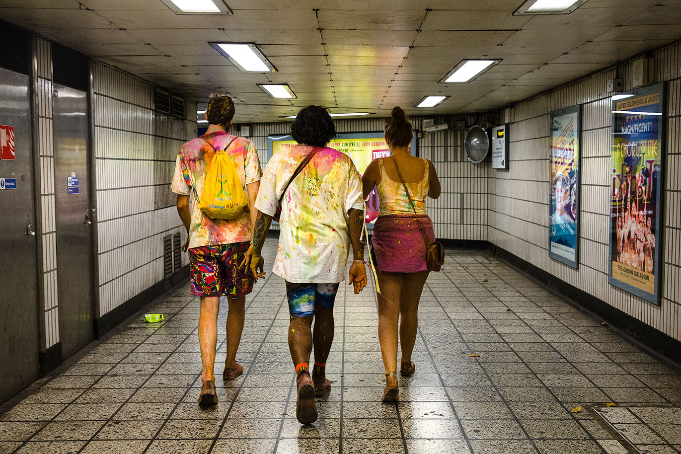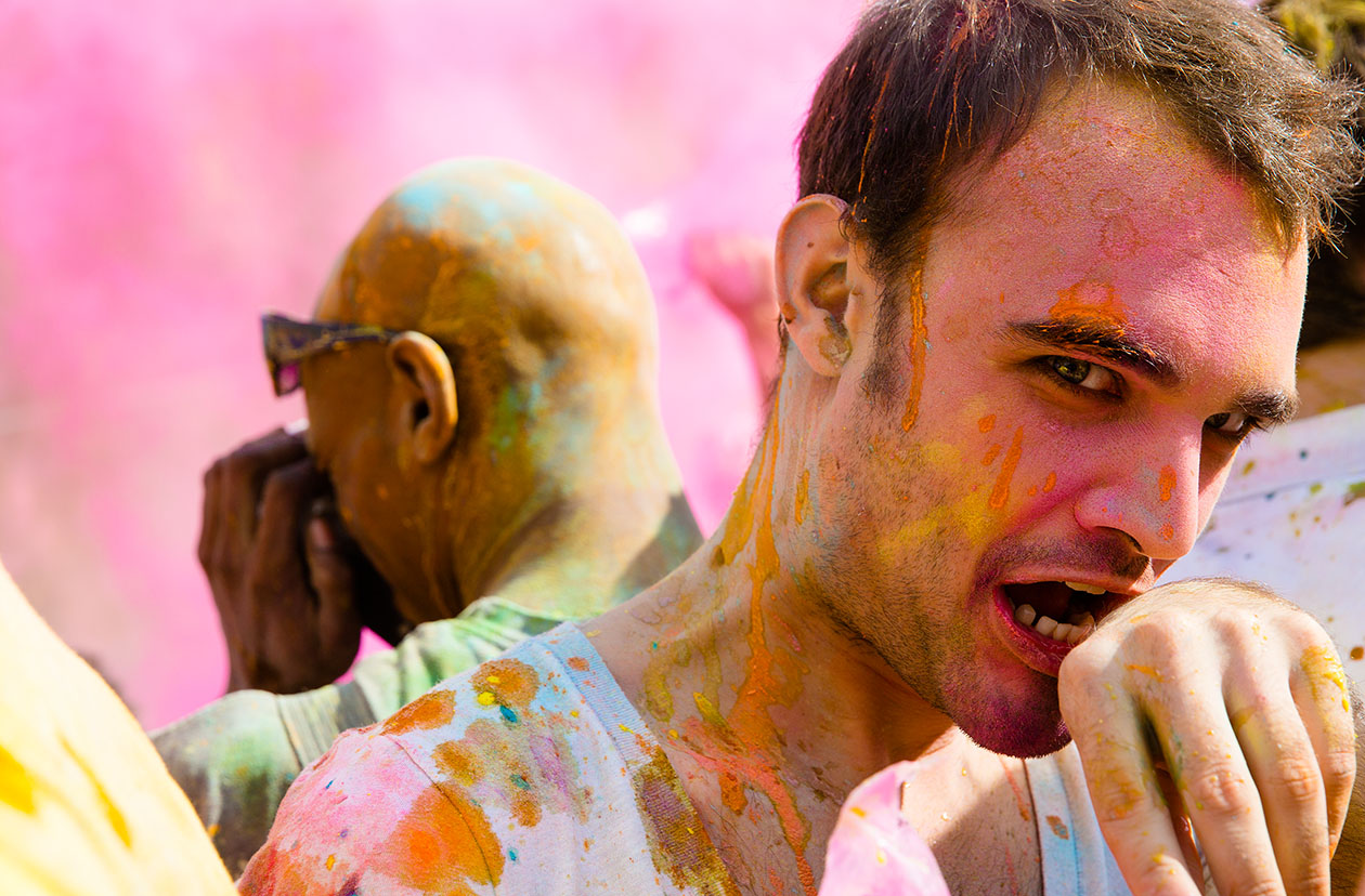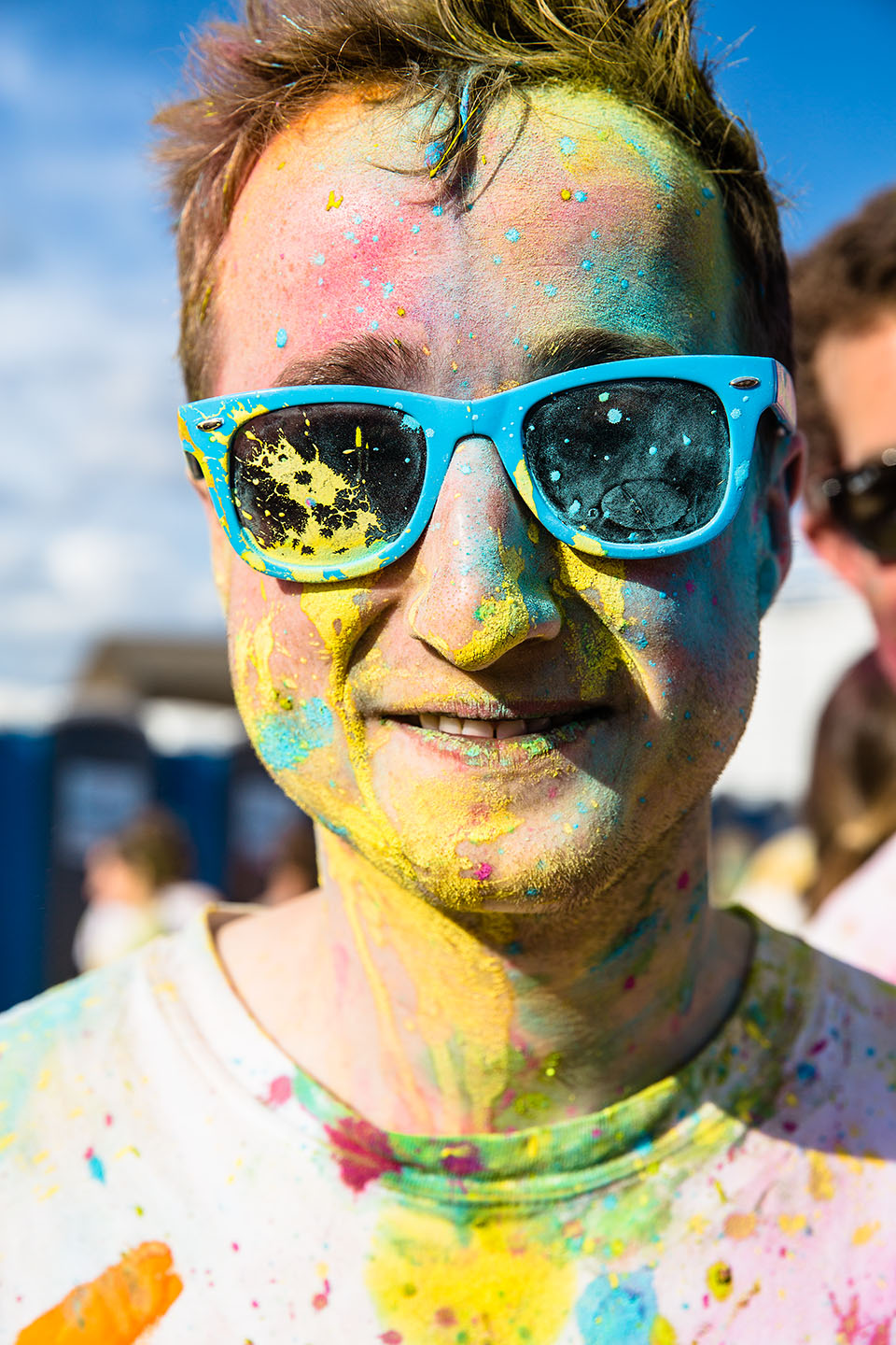 Every hour festival goers were encouraged to throw their powder en-mass. As they did, clouds of colour blocked out the sunlight, and participants were caked from head to toe in layers of powder.