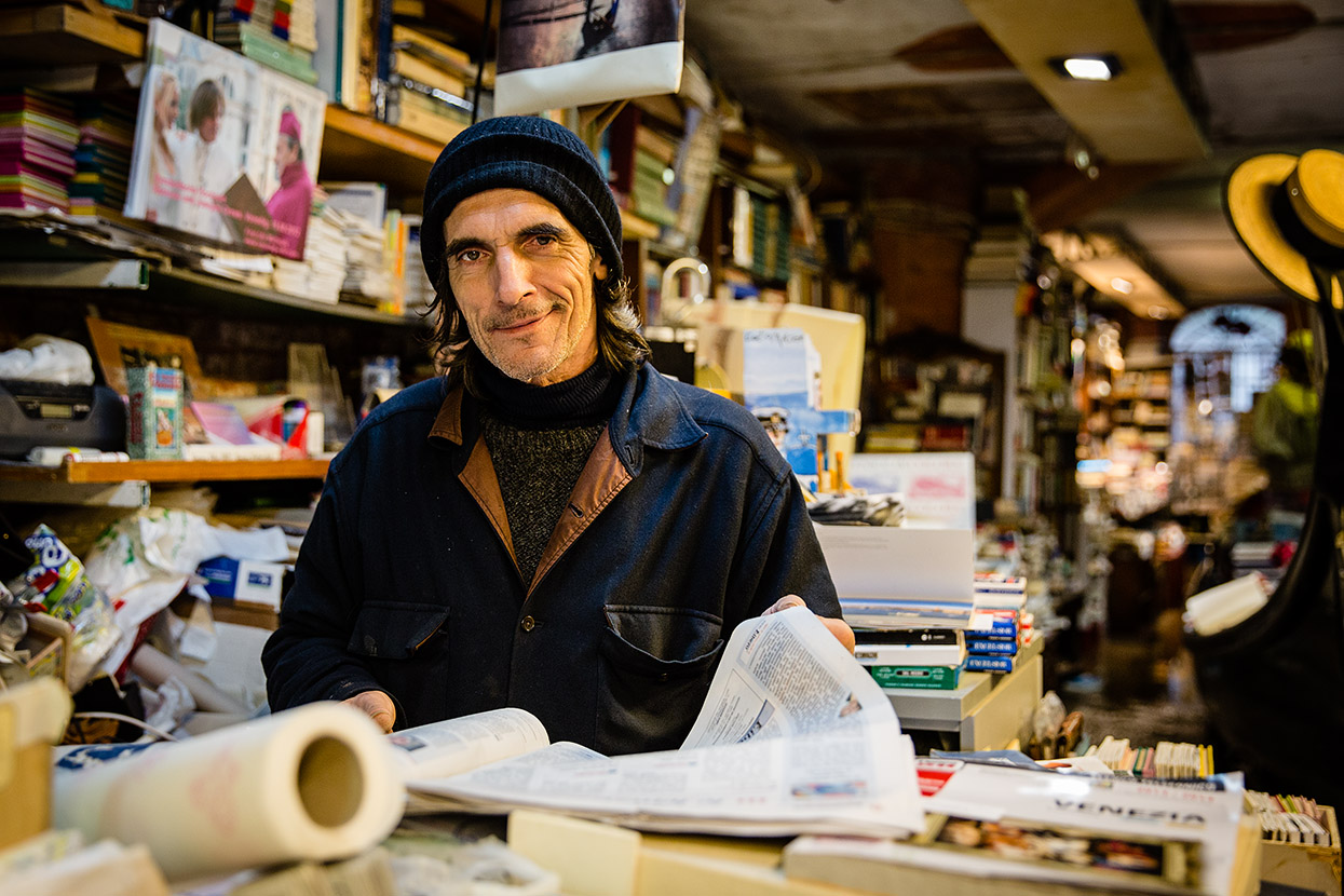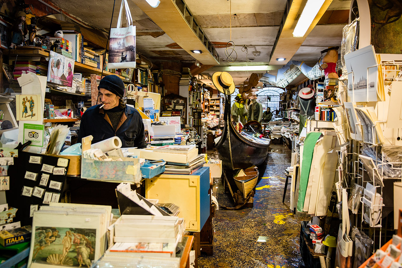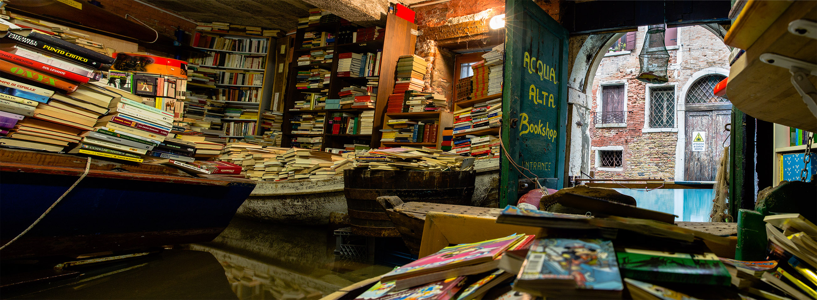 Venice is flooded. People are wading along the streets in a foot or two of water and the building are boarded up. But the Libreria Acqua Alta is still open for business. In fact it’s in its element.