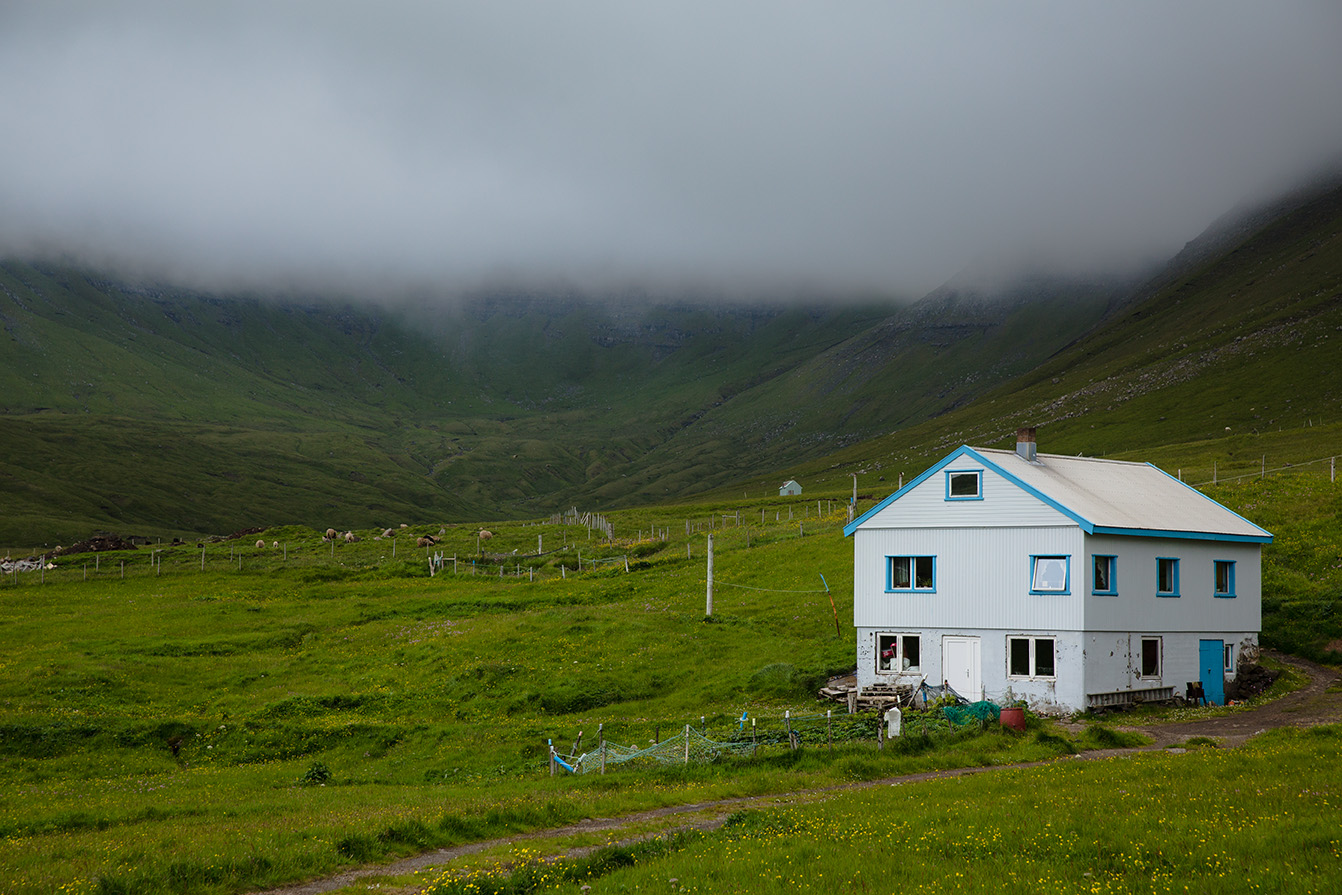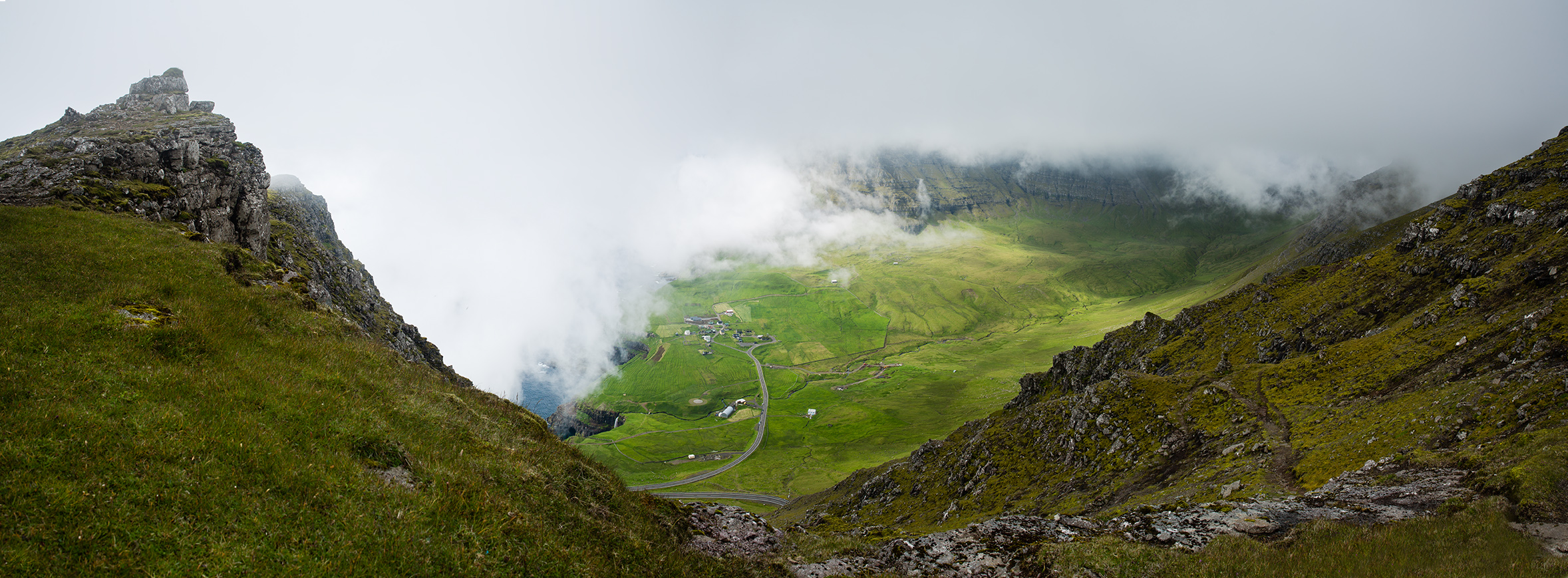 I felt a little anxious leaving my spot on the grass. Having watched the clouds close in I knew where things were, namely the 200m drop. The beautiful village of Gásadalur is surrounded by mountains on three sides, and this inaccessibility is its charm. Within moments I didn’t even know where I had come from as I hauled myself up higher, but so long as I kept my course as straight as possible then the edge would be a safe distance away. This didn’t stop it from feeling a little suicidal, though.