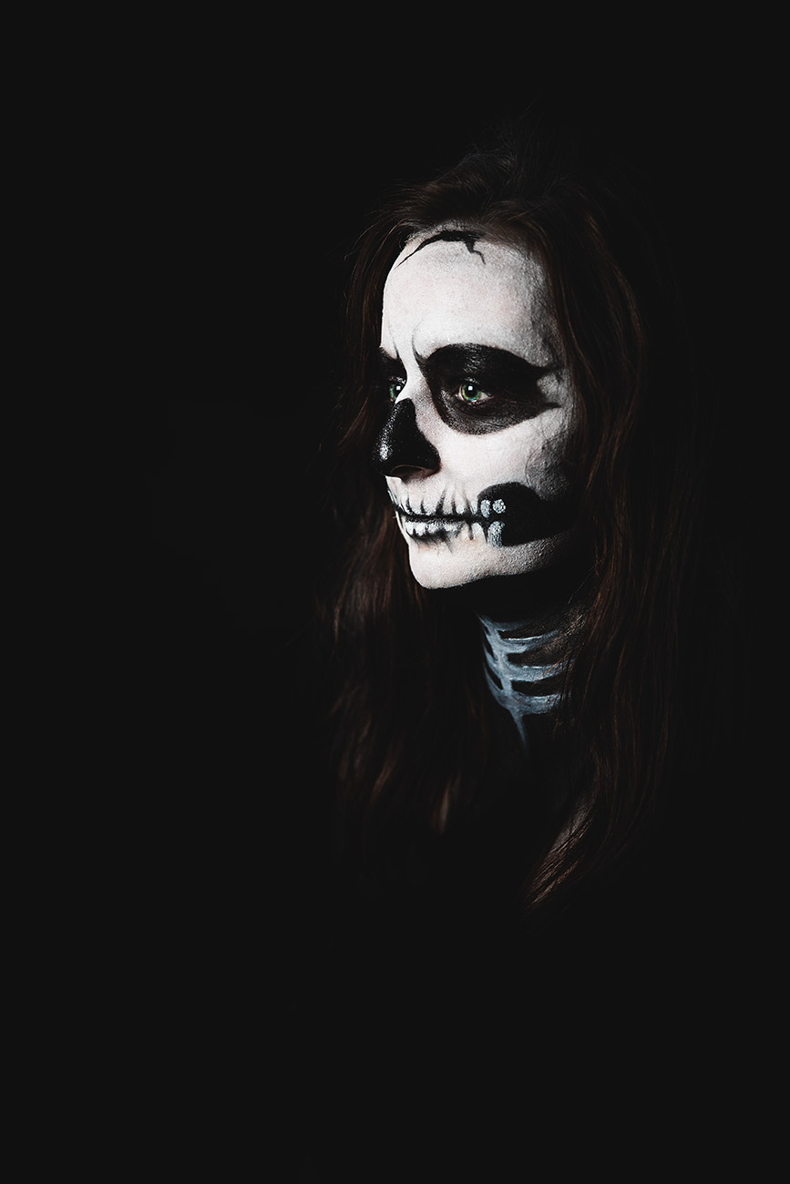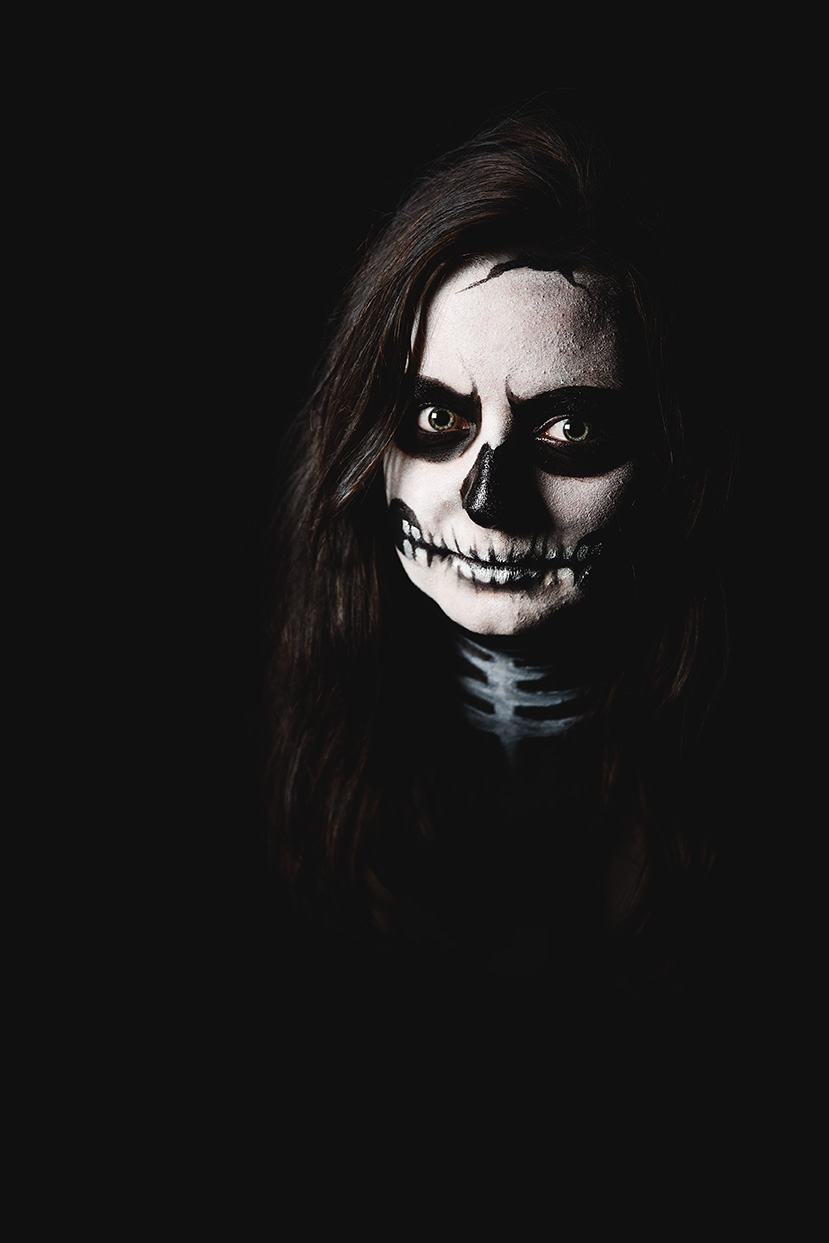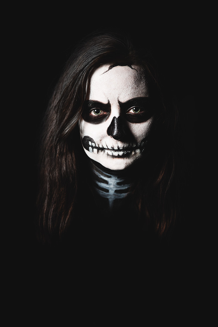 (This was done with a combination of white face paint for the base, pencil eyeliner for the outline, and black lipstick for the fill – which did a much better job than face paint!)
